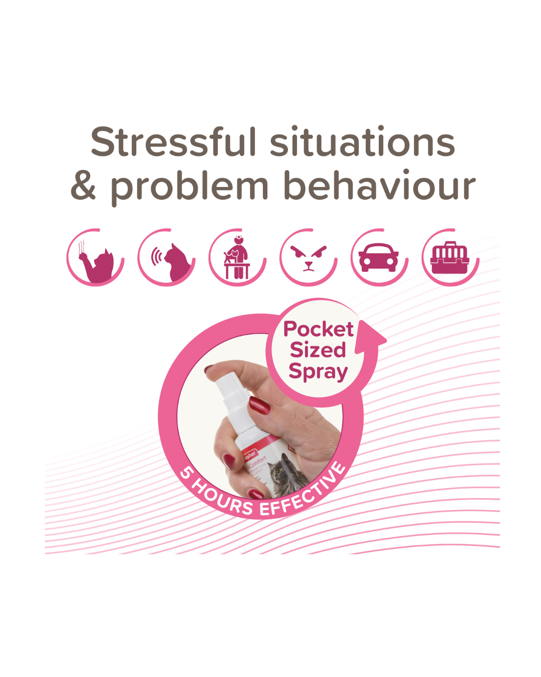 Può essere utilizzato durante eventi stressanti come fuochi d'artificio o feste, è particolarmente utile nel trasportino per i viaggi in auto o per il viaggio dal veterinario o da gattili. Ogni applicazione dura fino a 5 ore.